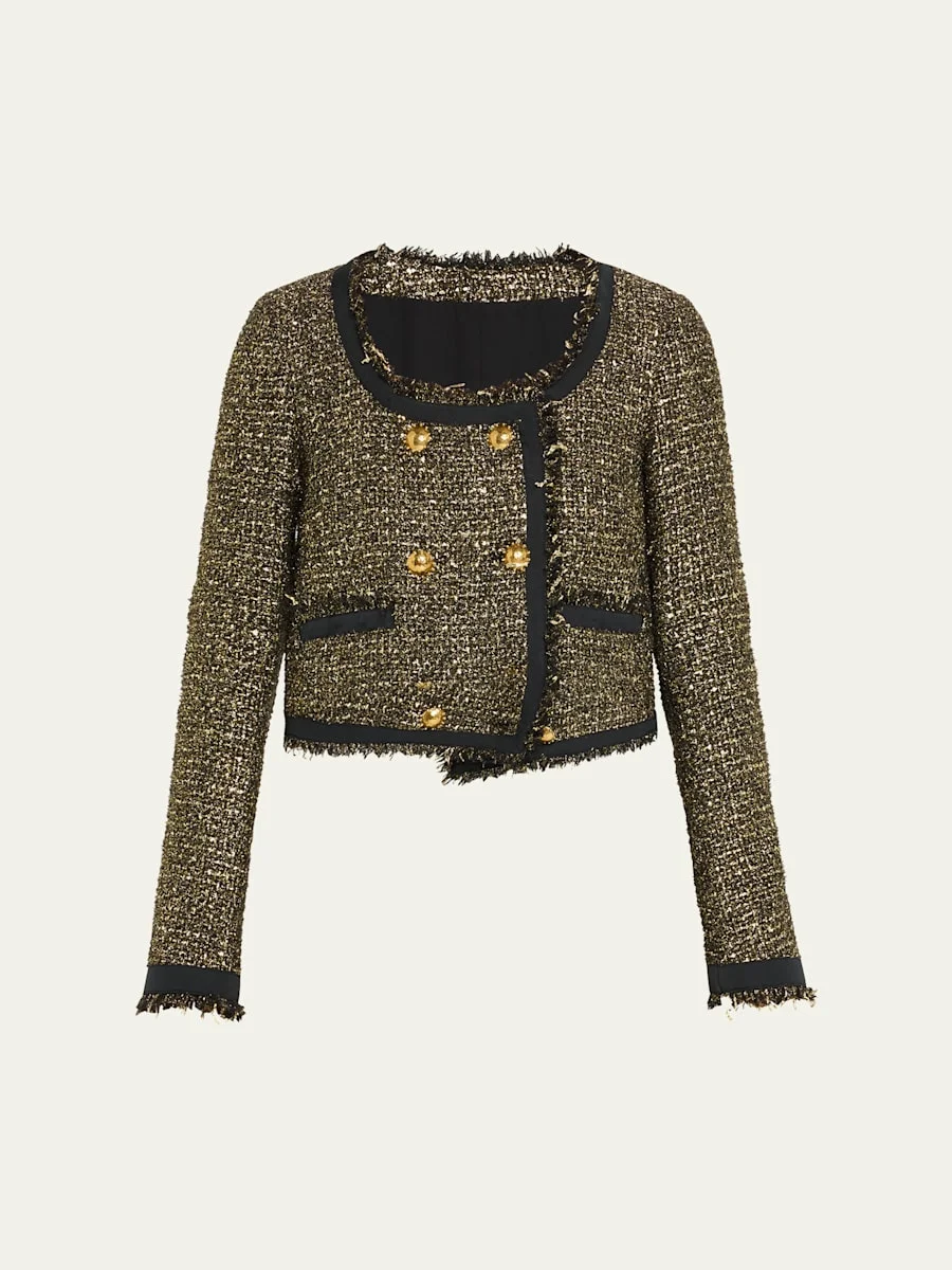Ulla Johnson "Anisa" sparkly tweed jacket finished with frayed trim Scoop neckline Double-breasted front Long sleeves Welt pockets Tailored fit Cropped length Button-front Nylon/polyamide/wool/acrylic Dry clean Imported Online Inquiries: BGS21_T6YSJ| Store Inquiries: #5060449