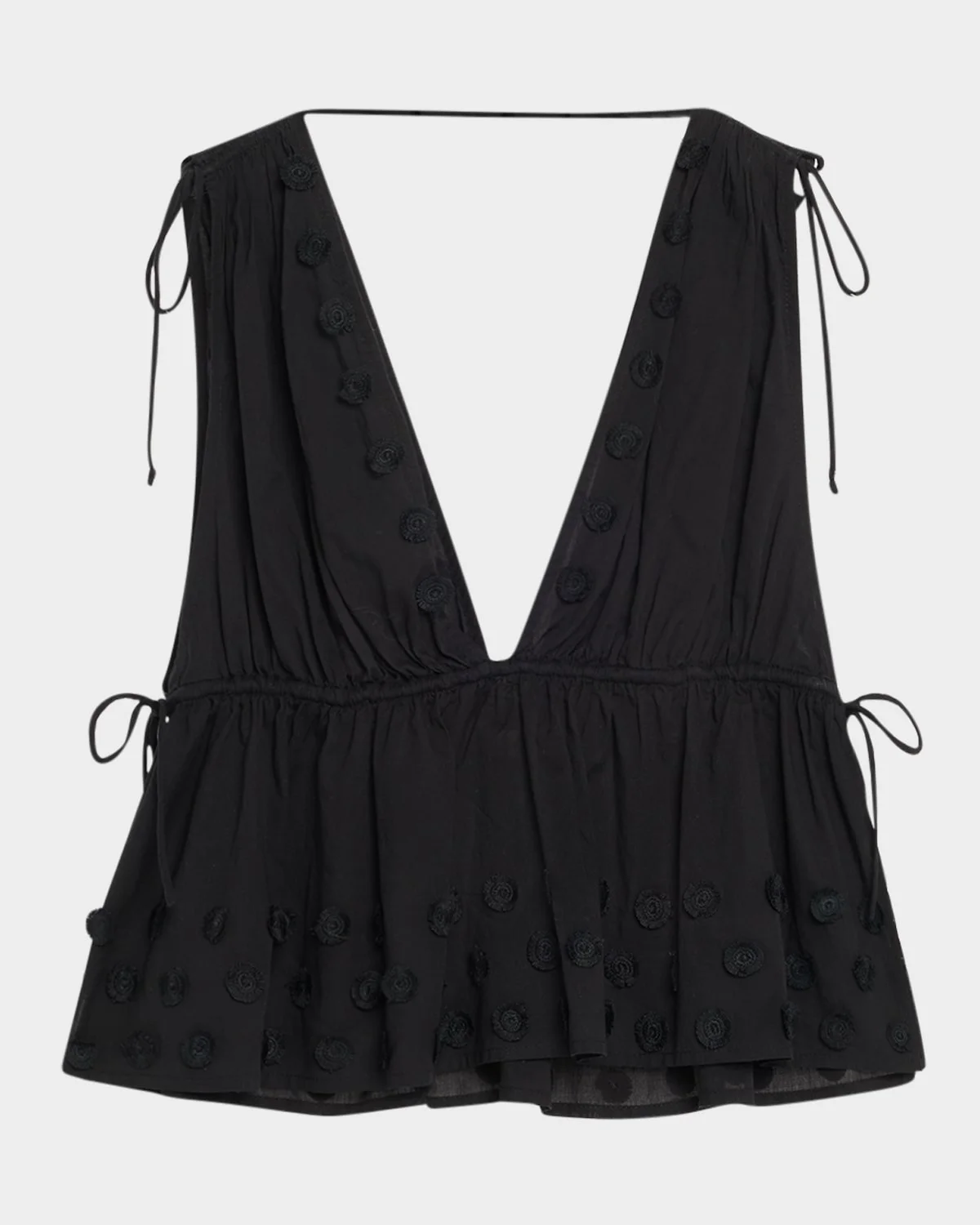 - Ulla Johnson "Anya" coverup top with embroidered trim detailing and self-ties throughout - Plunging V neckline - Sleeveless - Relaxed fit - Hip length - Slipover style - Cotton - Imported