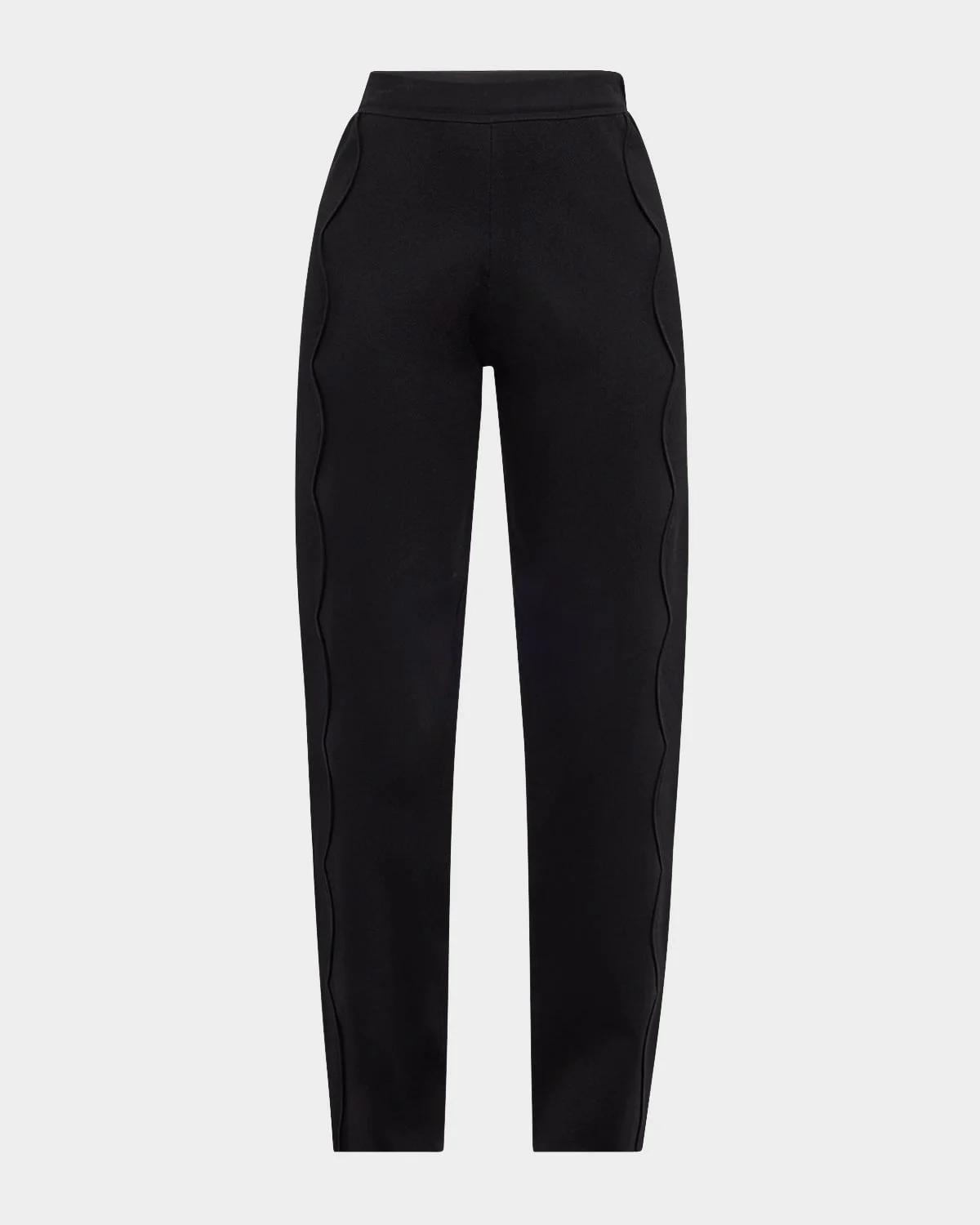 Ulla Johnson "Asher" pants with scalloped side details Approx. measurements: 28.5" inseam; 38.25" outseam Highrise sits high on the hips Elasticized waistband Flat front Full length Straight legs Pullon style Viscose/polyester Dry clean Imported