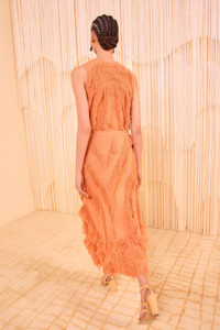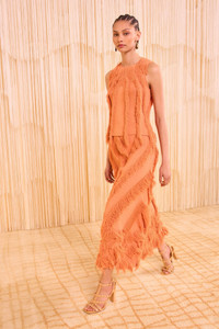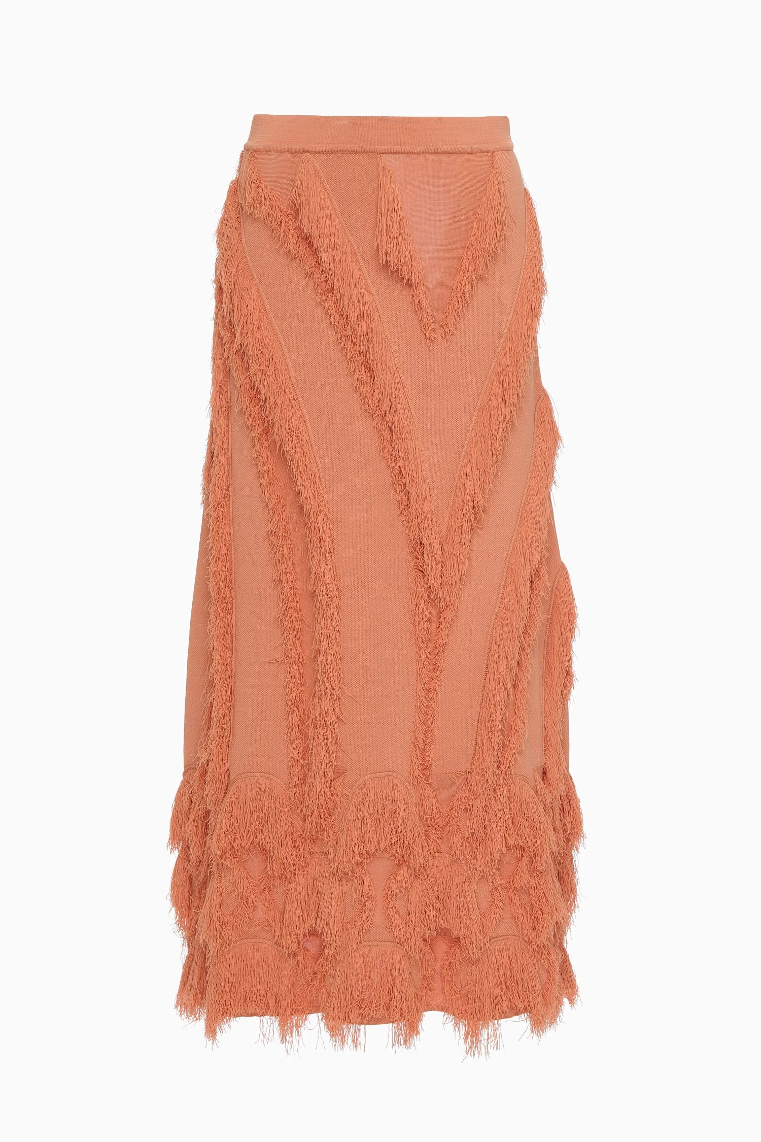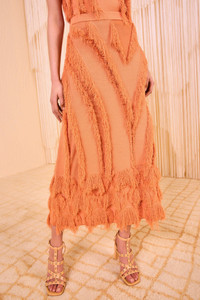 The Astrid Skirt is beautifully spun from jacquard with clipped threads that create floaty fringe, then further defined by added fringe appliques. Featuring a pattern unique to this style, this ethereal pink skirt has an elastic waistband for comfort and unfurls to a maxi silhouette alive in texture and movement. Composition: 65% Viscose, 35% Nylon Size & Fit - Model Height: 5'10" - This midi skirt has an elastic waistband and is designed to be worn at the high waist.