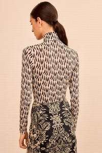 The Aurelia Turtleneck in lightweight jersey is a signature silhouette, reimagined with wavy vines evocative of feathery motion. This white and black top has a close fit that makes it perfect for layering or wearing on its own, while the high neck adds an elegant touch. - Tricot jersey - Model Height: 5'11" - Designed for a close fit - Turtleneck - Long sleeves - Pullover style - Composition: 91% rayon, 9% elastane - Gentle machine wash