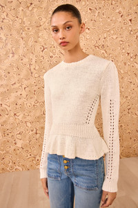 Cozy elegance defines the Aurelie Pullover, knitted from a soft cotton-blend adorned with delicate pointelle trims. This white crewneck has subtly puffed sleeves that are balanced by a flared peplum hem. - Italian cotton-blend knit - Model Height: 5'10" - Designed for a relaxed fit - Crew neckline - Gently puffed long sleeves - Peplum hem - Pullover style - Composition: 66% cotton, 34% polyamide - Gentle machine wash