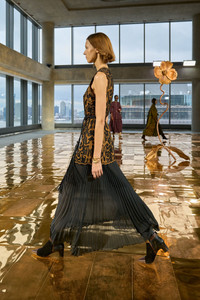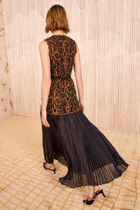 Debuting in Look 50 on the AW25 runway, the Auryn Dress is impeccably made from a Victorian-inspired embroidered applique, set against a delicate black mesh with intricate taffeta patchwork in rich saffron. This statement silhouette transforms into pleated habotai fabric at the skirt that also has a lustrous taffeta finish. - Mesh applique, taffeta, and habotai - Model Height: 5'10" - Designed for a close, structured fit at the bodice, loose at skirt - Midi length - Sleeveless - Lined in bodice - Button keyhole at back; concealed size zipper - Composition: shell 100% silk; combo 100% polyester - Dry clean only - Tassel belt for styling and not included with dress