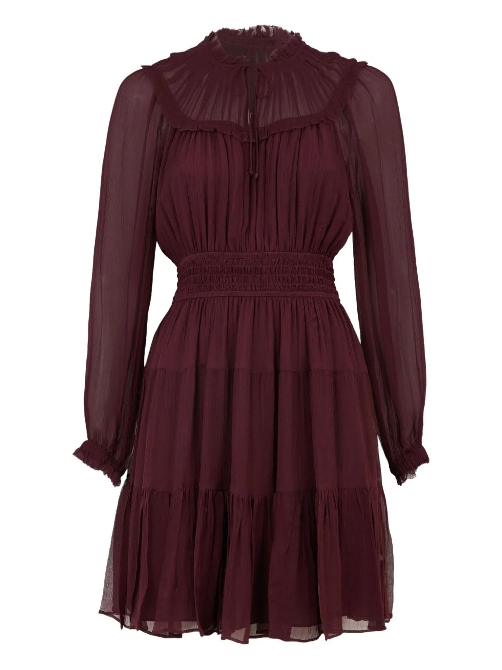 Ava silk mini dress Highlights - Brown - Silk - Ruffled trim - Tiered skirt - Long sleeves Imported Composition Silk 100% Washing instructions Read Manufacturer Guidelines