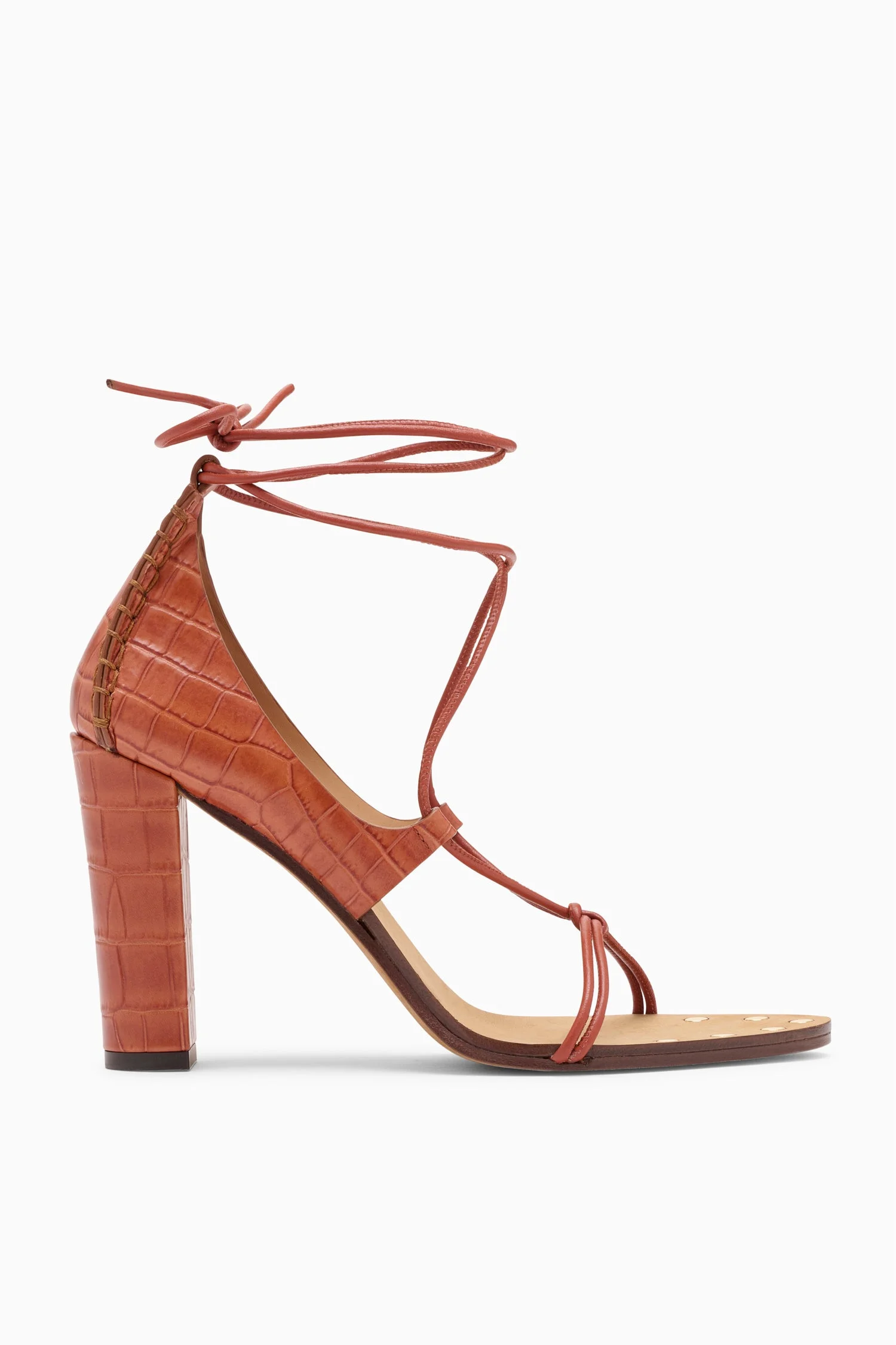Arriving on the Spring 2026 Runway, the Aves Bare Heel is a refined sandal imbued with artisanal details. It is sculpted in Italy from red croc-effect leather into a barely-there silhouette with hand-stitching, studded accents on the insole, and rests on a block heel for wearable ease. - Croc-embossed leather - Made in Italy - Open almond toe - 95mm heel - Ties at ankle - Style# SP261003