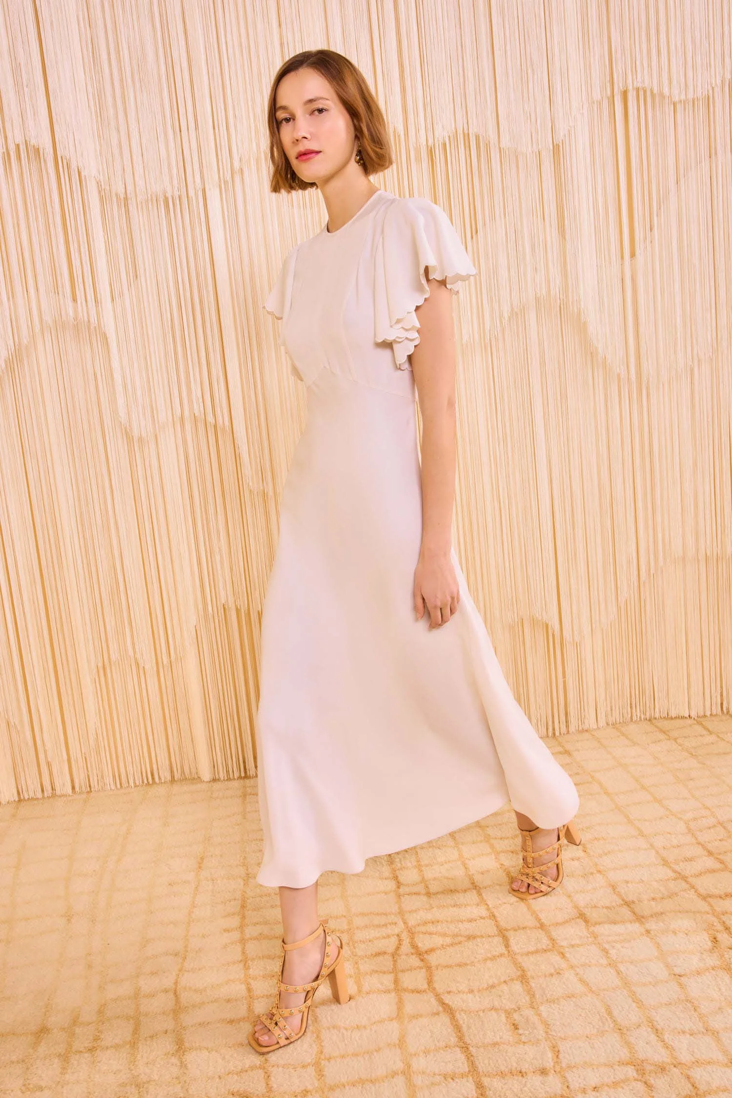 Timeless in form, the Blithe Dress is crafted from pristine white crepe with a satin underside that feels silky against the skin. This midi dress has a round neckline framed by beautifully scalloped, fluttering sleeves and is adorned at the bust with tonal seam detailing. It has an elegant slim fit and fastens with a discreet back zipper. Composition: 100% Viscose