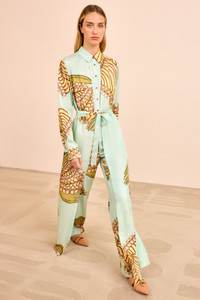 The Bricolage Jumpsuit is cut from soft blue silk twill, richly patterned with gestural, otherworldly florals by Art Brut painter Anna Zemankova. An elevated update to the classic jumpsuit, this style features a fluid overlay that creates graceful volume from the bodice to the wide leg. - Italian silk twill - Model Height: 5'11" - Designed for a loose fit, removable waist tie - Long sleeves with button cuffs - Side pockets - Mother-of-pearl buttons along front - Composition: 100% silk - Dry clean only This item is part of our collaboration with the foundation of Anna Zemankova.