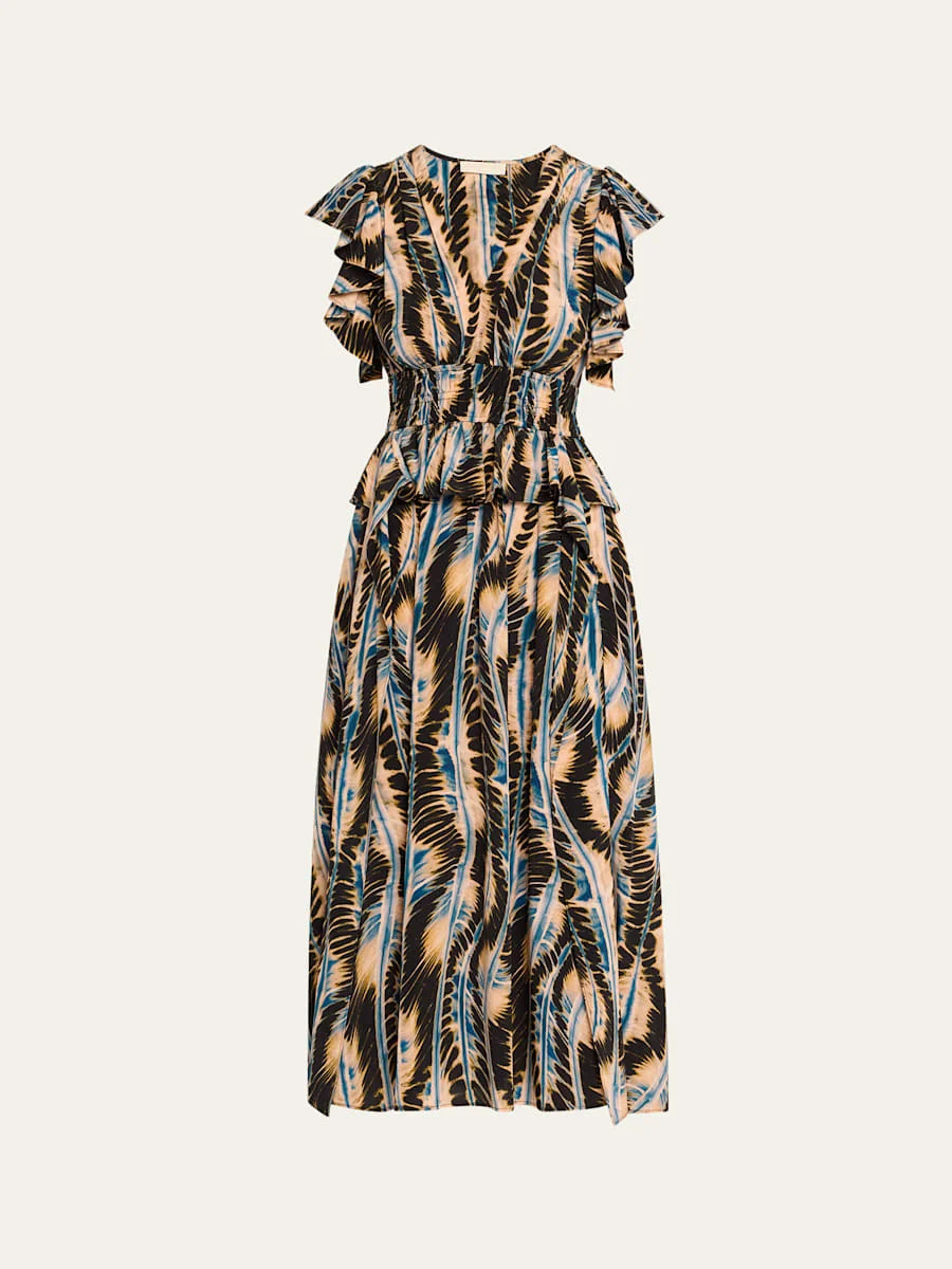 Ulla Johnson "Brielle" printed dress framed with flutter sleeves Approx. 48.8"L from shoulder to hem V neckline Short sleeves; approx. 4.3"L Shirred waistband Hem falls below the knee A-line silhouette Slipover style Silk Dry clean Imported Online Inquiries: BGS21_T922L| Store Inquiries: #4952767