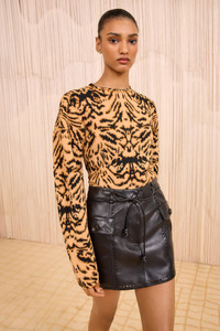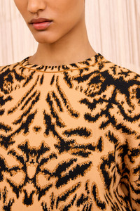 Striking in pattern, the Cade Pullover is spun from stretch jacquard knit with a vibrant, animal-inspired motif in light gold and black. This cold-weather essential has a classic crewneck and is finished with statement voluminous sleeves. - Jacquard knit - Model Height: 5'10" - Designed for a relaxed fit - Crew neckline - Long sleeves - Pullover style - Composition: 83% viscose, 17% polyester - Dry clean only