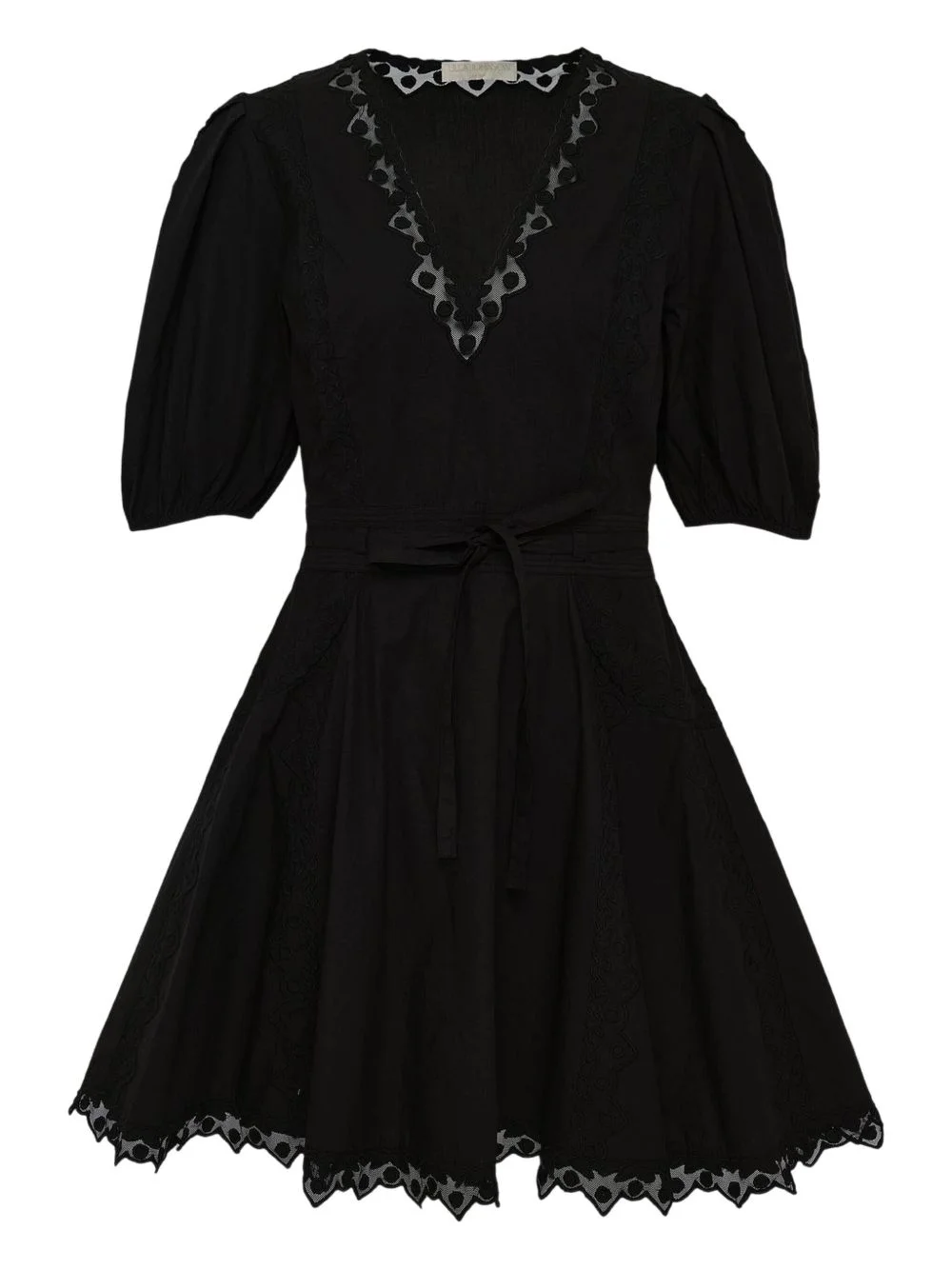 Camila short-sleeve mini dress Highlights - Black - Lace trim - V-neck - Self-tie belt Imported Composition Cotton 100% Washing instructions Read Manufacturer Guidelines