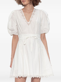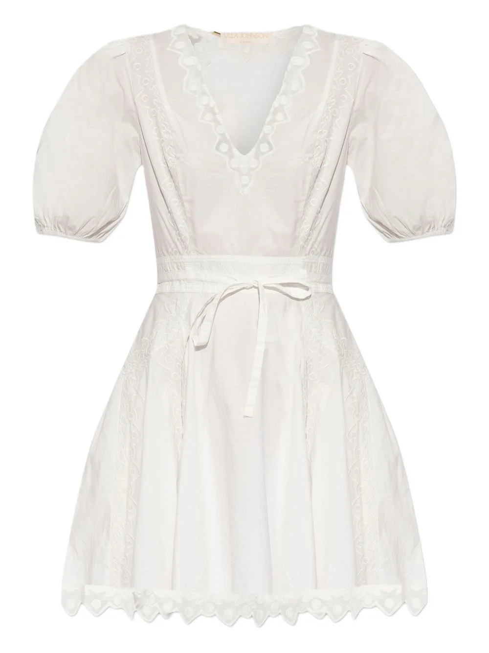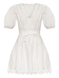 puff-sleeve embroidered dress Highlights - White - V-neck - Embroidered details - Puff sleeves - Lace trim - Tie waist Imported Composition Cotton 100% Washing instructions Read Manufacturer Guidelines