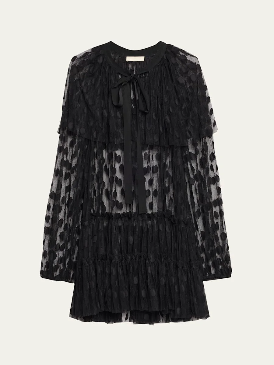 Ulla Johnson "Audette" sheer polka dot lace mini dress elevated with a self-tie V neckline Long sleeves with elastic cuffs Tiered silhouette Hem falls above the knee Slipover style Nylon/polyamide/cotton Imported Online Inquiries: BGS21_T6YRX| Store Inquiries: #5060424