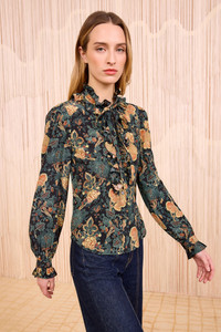 The Catroux Blouse is adorned with 19th century-inspired French florals enriched with graphic engravings. Crafted from signature silk crepe de chine, this multicolored top is imbued with poetic detailing, with frills at the collar and fluted cuffs. - Silk crepe de chine - Model Height: 5'11" - Designed to be slightly loose - Neckties - Long sleeves with button cuffs - Mother-of-pearl buttons through front - Composition: 100% silk - Dry clean only