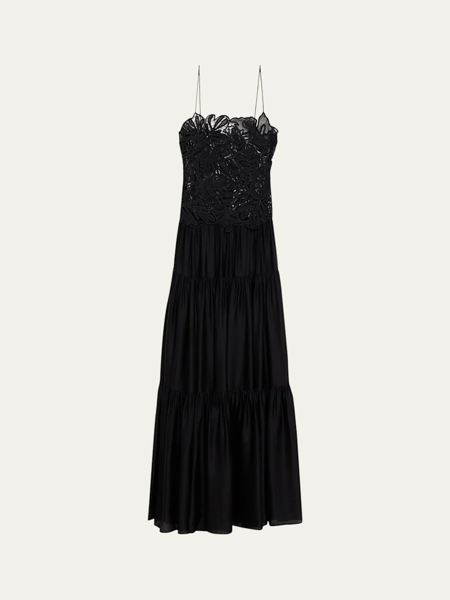 A silhouette that balances softness with sharp details, the "Celestia" gown by Ulla Johnson is crafted from luxurious silk and boasts an intricate embroidered bodice that effortlessly flows into a voluminous, tiered skirt. Square neckline Delicate straps Dropwaist silhouette Full length Invisible side zip Silk Dry clean only Imported SIZE amp; FITModel measurements: 5'10" tall Model is wearing a US size 4/Small