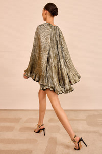 Perfect for occasions, the Claire Dress is richly crafted from Italian satin in luminous gold that is imbued throughout with a crinkled texture. This fluid dress is structured with grosgrain trims that bring volume to the hem, creating graceful movement at every stride. - Italian crinkled lurex satin - Model Height: 5'10" - Designed for a relaxed fit with volume at hem - Mini length - Round neckline - Long bell sleeves - Silk lining - Concealed back zipper - Composition: 100% polyester - Delicate dry clean only