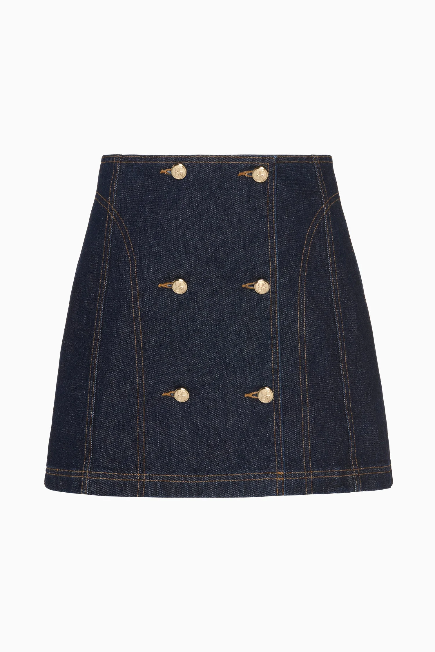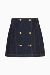 The Clara is our take on the classic mini skirt. It is responsibly handmade in Los Angeles in our deep, vintage-inspired Tigris wash and is further refined with contrast stitching. This mini denim skirt fastens with a placket through the front that references traditional military styles, while the monogram-adorned buttons add an elevated touch. Composition: 100% Cotton Size & Fit - Model Height: 5'9"