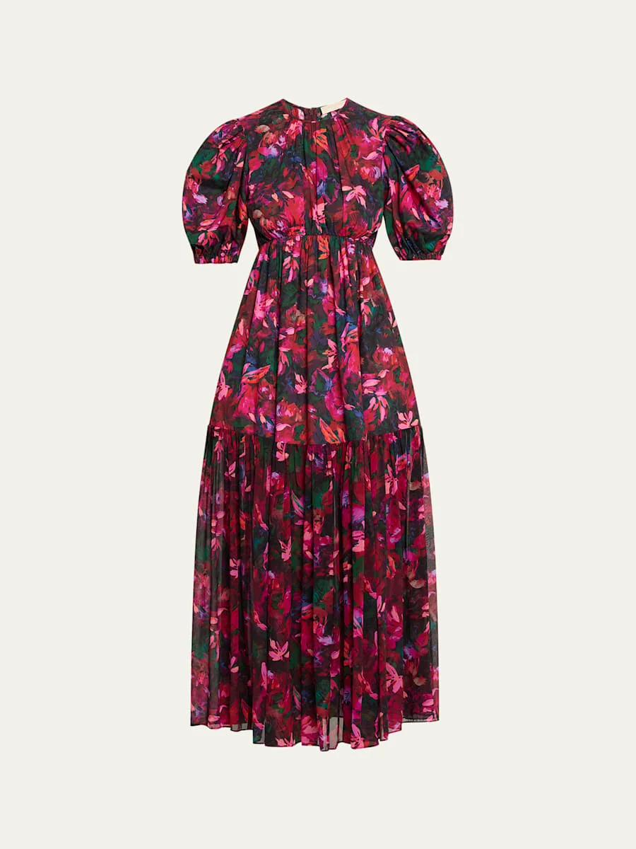 Ulla Johnson "Collage" hibiscusprinted dress Approx. 54.3"L from shoulder to hem Round neckline Elbowlength puff sleeves; approx. 14.9"L Selftie elasticized cuffs Hem falls below the knee Aline silhouette Invisible back zipper Cotton/silk Dry clean Imported