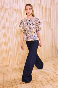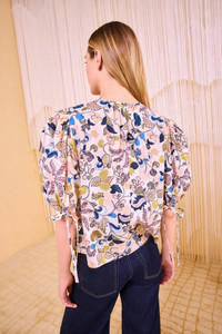 Rendered in crisp poplin, the Coralie Blouse is an effortless top that elevates the mood with intricately layered botanicals inspired by a vintage batik print. This multicolored top features an architectural silhouette, with gathering at the front and puff short sleeves that fasten with tied cuffs. Composition: 100% Cotton Size & Fit - Model Height: 5'11"