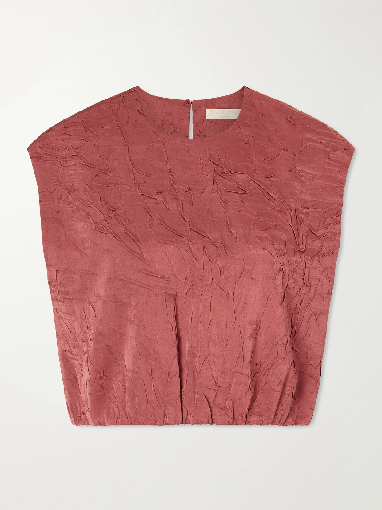Ulla Johnson blends texture and color into modern, art-inspired staples with the ‘Gisella' top. Featured on the SS26 runway, it's made from satin with heat-pressed crinkles that evoke a painter's canvas, while gathers at the hem create gentle volume and a soft, sculptural silhouette in faded red.