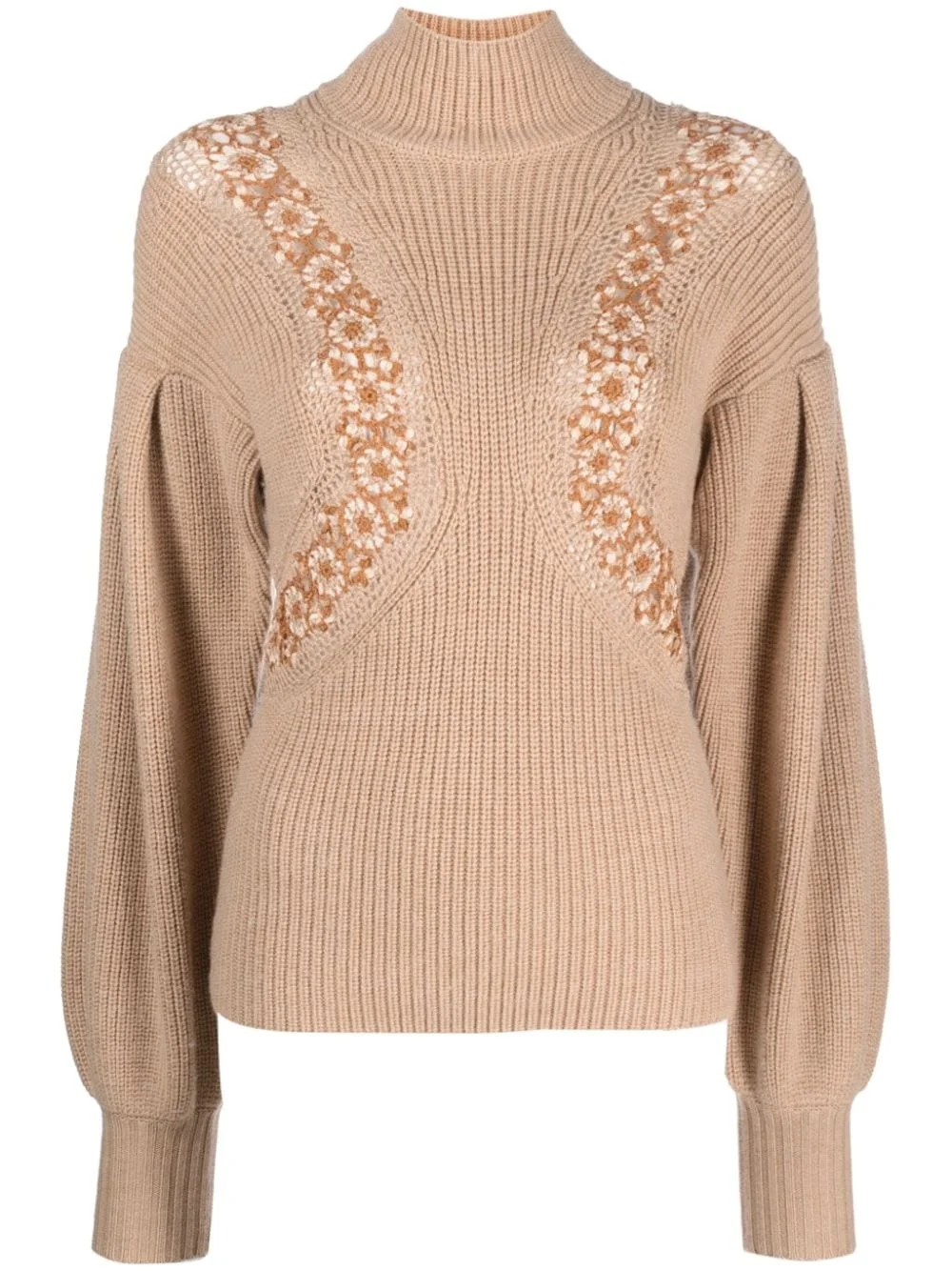 crochet-detail merino jumper Highlights - Camel brown - Merino wool - Knitted construction - Straight hem - Long puff sleeves - High neck - Crochet knit - Ribbed cuffs and hem Imported Composition Merino 100% SIZE & FIT Model measurements Height 5 ft 10 in(1.77 m) Bust/Chest 32.28 in(82 cm) Hips 35.03 in(89 cm) Waist 25.19 in(64 cm) FittingInformation Designed for a slim fit that sits just away from the body offering a close yet comfortable fit Made with a midweight knit, this piece offers some stretch This piece fits true to size – take your usual size Washing instructions Hand Wash