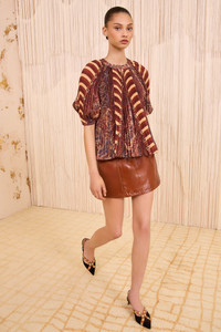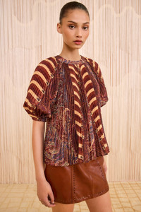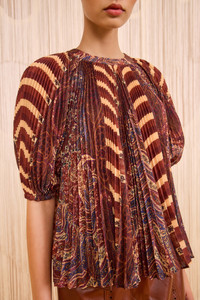 Rich in visual dialogue, the Dafne Top is cut from voile fabric with feather paisley and striped motifs that unfurl across accordion pleating. This multicolored top is structured with signature puffed sleeves and flows with poetic movement. - Voile - Model Height: 5'10" - Designed for an oversized fit - Short sleeves with elastic cuffs - Pullover style - Composition: 100% polyester - Dry clean only
