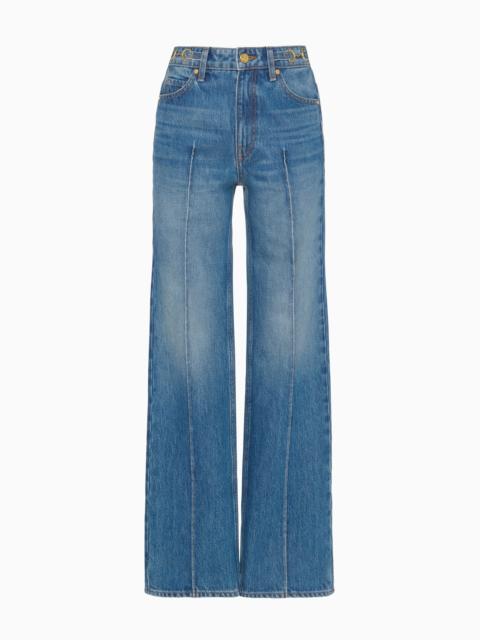 The Delphine Jean is the newest addition to the Ulla Johnson denim lineup. The medium indigo wash provides timeless versatility, while the Hollywood waistband creates a clean finish. Custom twisted gold hardware finishes this elevated essential. - Non-stretch denim - Handcrafted in Los Angeles - Model Height: 5'11" - High-rise, flared leg - Back pockets - Inseam: 33 - Signature monogram leather patch and hand-hammered ring - Front button and concealed zipper - Composition: 100% cotton - Machine wash cold
