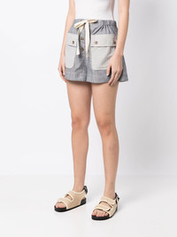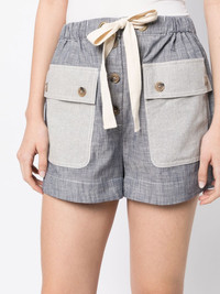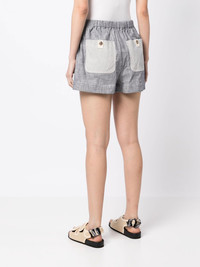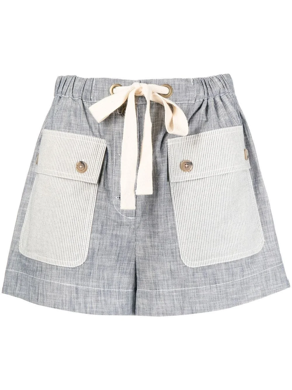 drawstring-waist shorts granite grey/blue cotton vertical stripe pattern elasticated drawstring waistband front button fastening two front patch pockets two rear patch pockets above-knee length Imported Composition Body: Cotton 100% SIZE & FIT Model measurements Height 5 ft 10 in(1.78 m) Bust/Chest 33.46 in(85 cm) Hips 35.43 in(90 cm) Waist 24.4 in(62 cm) FittingInformation This piece fits true to size. We recommend you get your regular size Designed to be fitted at the waist, loose over the leg Made with a mid-weight non-stretch fabric