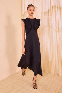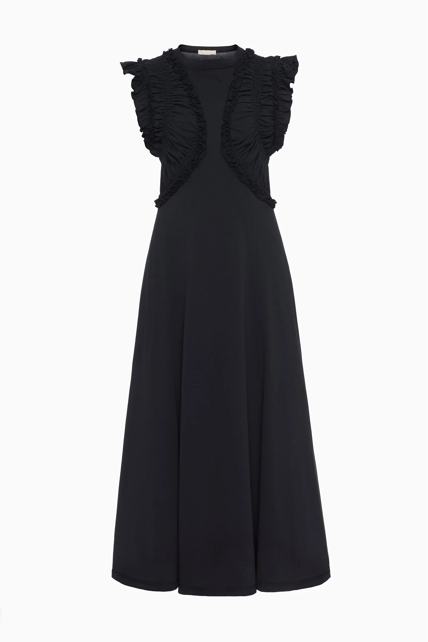 Understated elegance arrives in the Shiva Dress, cut from black organic cotton jersey with a classic crewneck and midi silhouette that lightly skims the form. It has a sleeveless profile defined at the bodice by intricate ruching and dancing ruffles. This style easily pulls over. Composition: 100% Cotton Size & Fit - Model Height: 5'10"
