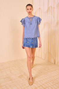Crafted from water-washed cotton, the Effie Top is an easy summer layer, elevated with tonal geometric embroidery and tulle appliques that subtly reveal. This light blue top is framed by fluttering short sleeves and has a loose fit that easily tucks into your favorite separates. It pulls over and has front neckties that can be fastened or left undone. Composition: 100% Cotton Size & Fit - Model Height: 5'10"