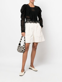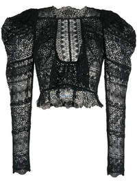 Eloise lace blouse black cotton-silk blend lace panelling round neck long puff sleeves scallop hem Imported Composition Cotton 100%, Silk 100% SIZE & FIT Model measurements Height 5 ft 10 in(1.78 m) Bust/Chest 33.07 in(84 cm) Hips 35.82 in(91 cm) Waist 25.98 in(66 cm) FittingInformation This piece fits true to size. We recommend you get your regular size Cut for a slim fit Made with a mid-weight non-stretch fabric Washing instructions Dry Clean Only