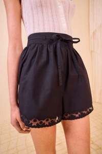 The Elowen Short is made from soft, water-washed poplin in classic black for optimized versatility. This breezy style is adorned with geometric tonal embroidery and tulle appliques at the hem that play with transparency. It is designed to sit high at the waist with a removable belt, has side pockets, and fastens with a concealed side zipper. Composition: 100% Cotton Pair it with our Callie Knit Camisole and Gracie Pointy Toe Flat to complete the look. Size & Fit - Model Height: 5'10"