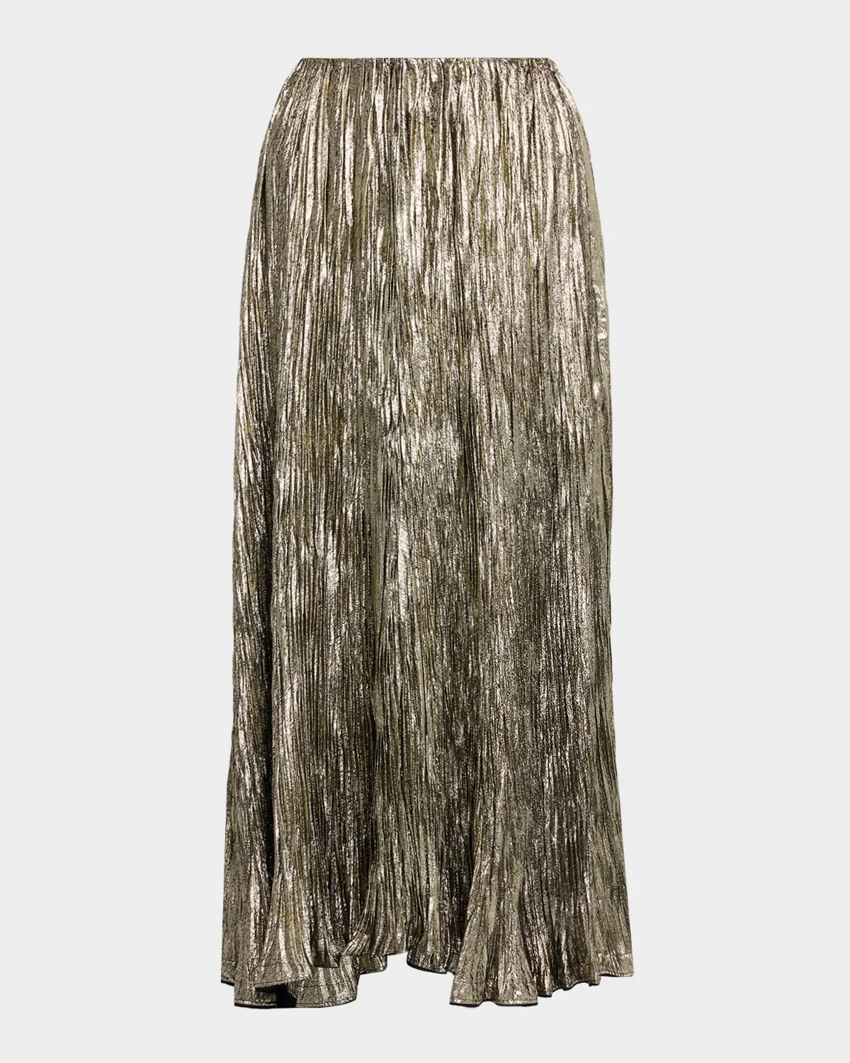 Crafted from Italian crinkled lurex satin, the "Elsa" skirt by Ulla Johnson is infused with crinkled texture and grosgrain trimming at the hem for added volume High rise Full length Aline silhouette Concealed side zipper Polyester Imported
