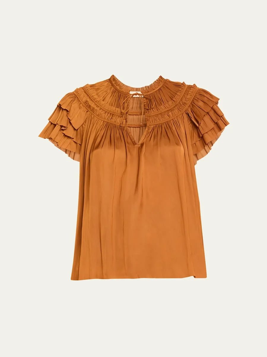 Ulla Johnson "Elvie" ruched top with ruffles Approx. 23.5"L from shoulders to hem V neckline; front selftie Short sleeves Relaxed fit Pullover style Polyester Dry clean Imported