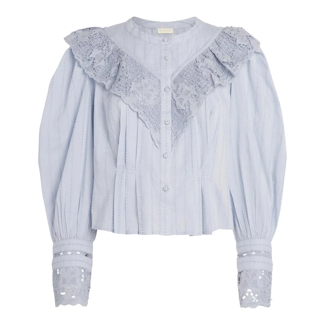 300048706LBL-02 / P5PF250242/00/CELES - Elaborate lace collar with scalloped edges - Matching lace cuff detailing - Button-front closure with covered placket - Pintuck pleated front panel - Gathered balloon sleeves - Elastic cuffs for secure fit - Lightweight cotton construction - Relaxed fit through body The Ulla Johnson Esther Long Sleeve Blouse delivers romantic femininity with intricate lace detailing and Victorian-inspired design. Crafted from lightweight cotton in soft powder blue, featuring elaborate lace collar and cuff embellishments with delicate scalloped edges. The pintuck pleating and gathered sleeves create a sophisticated bohemian silhouette that embodies Ulla Johnson's signature aesthetic.