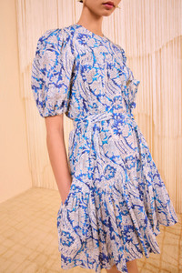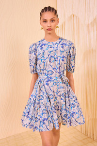 Crafted from a cotton blend with tonal stripes, our Rosalie Dress captures the eye with graphic botanicals inspired by a vintage indigo panel. This multicolored printed dress has gently puffed short sleeves and a voluminous silhouette that can be tempered with the removable tie belt. It has a gathered hemline for graceful movement, side pockets, and fastens with a center-back tie and button closure. Composition: 66% Cotton, 34% Viscose Size & Fit - Model Height: 5'10" - This mini dress has an oversized fit when unbelted. Use the tie belt to cinch the waist.