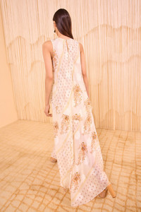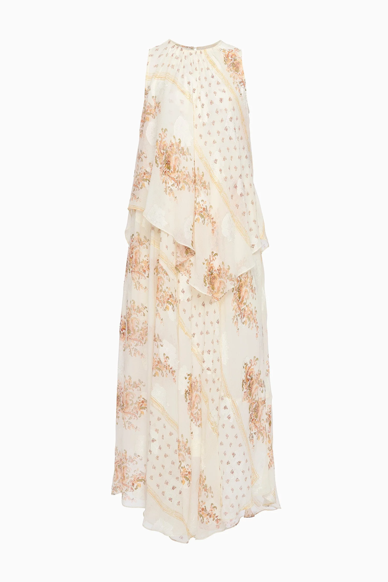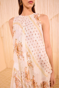 Dreamy chiffon meets luxurious jacquard in the Caprice Dress, featuring a delicate botanical scarf print layered atop tonal fil coupe blooms. Perfect for elevated occasions, this sleeveless white dress is designed with an asymmetric layered silhouette that moves with graceful volume. It fastens with a buttoned keyhole at the back. Composition: 64% Silk, 36% Viscose Size & Fit - Model Height: 5'10" - This midi dress is designed for a loose fit with a layered bodice and asymmetric hem.
