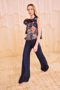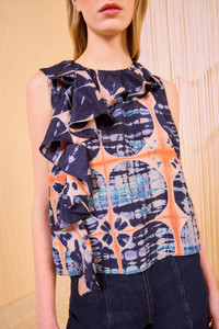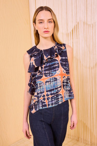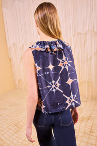 The Nya Top is the result of skilled artisan craft—it is hand-dyed by our longstanding partners in Bangalore with unique shibori textures in rich indigo hues. Crafted from weightless silk habotai, this multicolored sleeveless top has a flowy silhouette that’s playfully accented with a cascading ruffle and fastens with a single button at the center back. Due to the hand-dyed nature of this garment, each is uniquely beautiful and one-of-a-kind. Size & Fit - Model Height: 5'11"