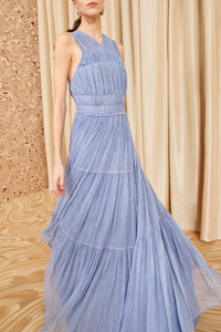 Exclusive to our boutiques and webshop, the Freesia Gown in slate blue is made from luxurious crinkle silk chiffon in a stunning flowing silhouette. This sleeveless style features a floor-sweeping skirt, a form-fitting bodice, and is fully lined. It fastens with a side zipper closure. Composition: 100% Silk