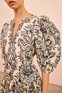 The Harriet Dress captures the eye with a graphic, symmetrical floral leaf print infused with subtle, batik textures. A signature Ulla Johnson silhouette, this ivory and black poplin dress is adorned with artfully tucked sleeves with elegant volume, a nipped waist, and gently flared hemline. - Cotton poplin - Model Height: 5'10" - Designed with a drawstring elastic waist, loose at bust and hip. - Midi length - V-neckline - Puffed short sleeves - Pullover style - Composition: 100% cotton - Gentle machine wash cold
