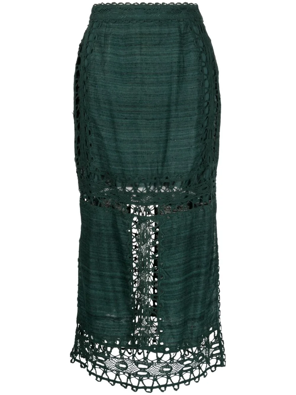 high-waisted lace skirt Highlights - Dark green - Cotton-silk blend - Lace detailing - High waist - Side zip fastening - Mid-length Imported Composition Outer: Silk 50%, Cotton 50% Lining: Cotton 52%, Viscose 48% SIZE & FIT Model measurements Height 5 ft 10 in(1.77 m) Bust/Chest 28.74 in(73 cm) Hips 35.82 in(91 cm) Waist 24.4 in(62 cm) FittingInformation This midi-length skirt is intended to be worn high on the waist Made from a midweight non-stretch fabric This piece fits true to size – take your usual size