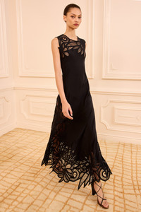 Exuding a sense of occasion, the Idra Dress arrives in black silk cut on the bias for a body-skimming fit. The surface unfurls with panels of embroidered botanicals, each thoughtfully placed to highlight the form. - Silk crepe de chine - Model Height: 5'10" - Designed for a body-skimming fit - Maxi length - Round neckline - Sleeveless - Bias cut - Removable slip lining - Button keyhole at back - Composition: 100% silk; combo: 100% polyester - Dry clean only - Style# SP260118