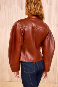 The Ilaria Jacket is a wardrobe heroine in supple Italian lambskin, tailored with sculptural sleeves and a cropped, modern fit. A rich and versatile brown, this moto jacket gently nips in the waist and features timeless snap detailing at the neck and lapels. - Italian leather - Model Height: 5'11" - Designed to be fitted at the bodice - Front pockets - Asymmetric front zipper - Composition: 100% lambskin leather - Dry clean only by leather specialist