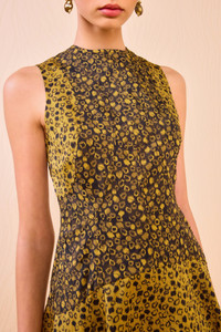 The Isadora Dress comes to life in lightweight faille jacquard, its surface adorned with dotted, animalesque motifs layered into a mesmeric, gilded patchwork. Timeless in silhouette, this A-line dress has a round neckline, a close-fitting bodice detailed with architectural seams, and a flared hemline full of movement. This black and gold maxi dress fastens with a concealed back zipper. Composition: 71% Polyester, 25% Silk, 4% Polyamide