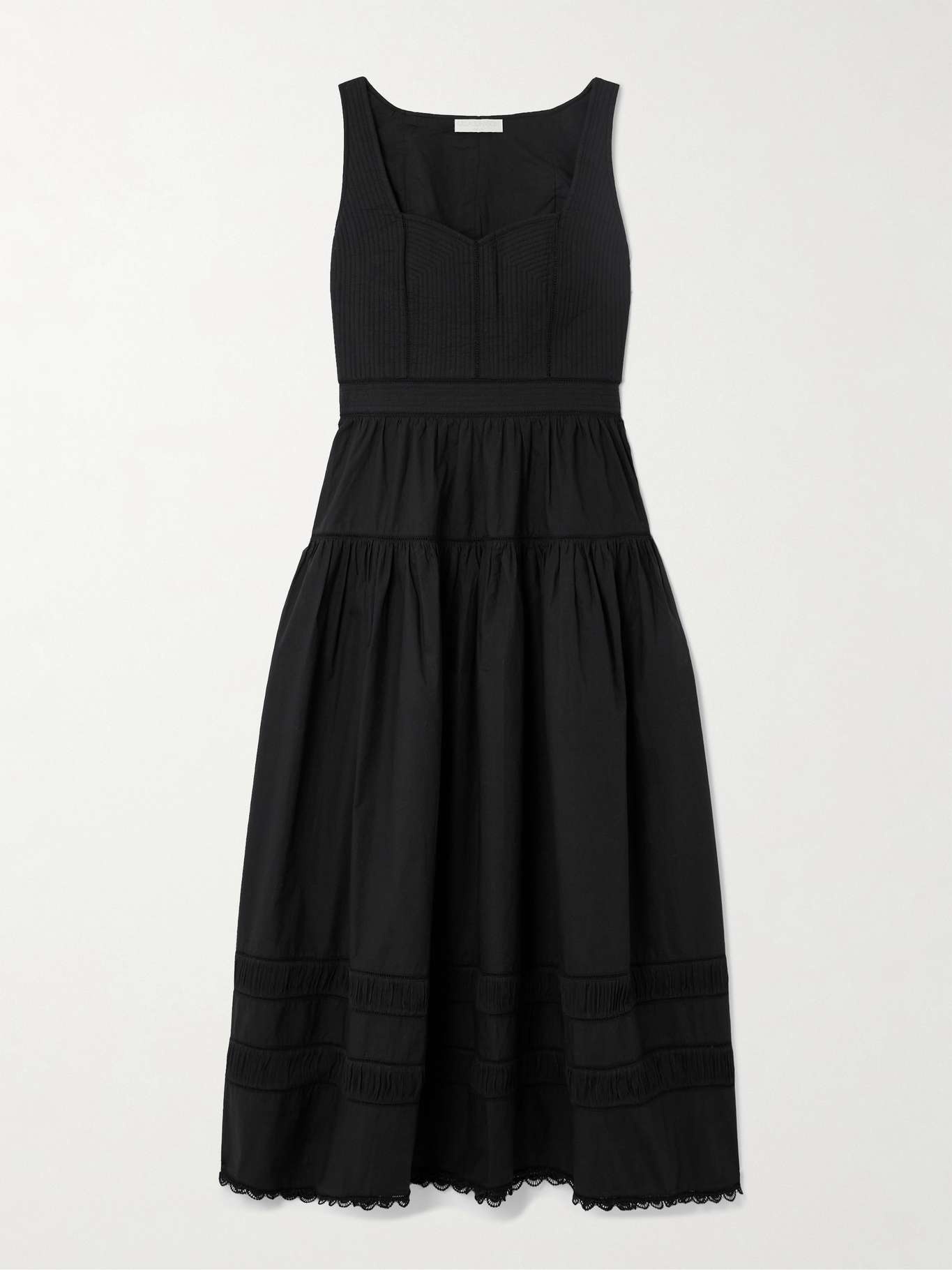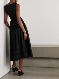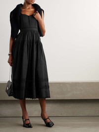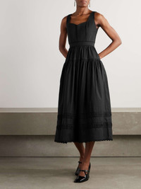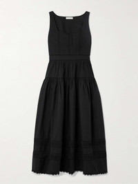 EDITORS'NOTES Ulla Johnson’s ‘Isadora’ midi dress is created with meticulous attention to every last detail, from the geometric quilting along the bodice to the scalloped lace trimming the floaty hem. It's made from cotton-poplin and has a tiered design with a nipped-in waist. Large to size. See Size & Fit notes. SIZE & FIT Model measurements: - Fits large to size, take one size smaller than normal - Designed to be slightly fitted at the bust and waist, loose at the hip - Lightweight, non-stretchy fabric - Model is 180cm/ 5'11", normally wears a US 2 and is wearing a US 0 - Bust: 77cm/ 30.5" - Waist: 60cm/ 23.5" - Hip: 92cm/ 36" DETAILS & CARE - Black cotton-poplin and lace - Concealed hook and zip fastening at side - 100% cotton; trim: 100% rayon - Machine wash