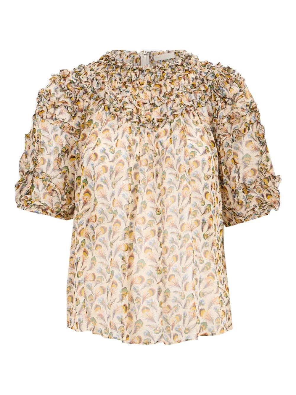 Isolda blouse Highlights - Beige - All-over print - Ruffled details - Short sleeves - Round neck - Rear zip fastening Imported Composition Silk 100% Washing instructions Read Manufacturer Guidelines