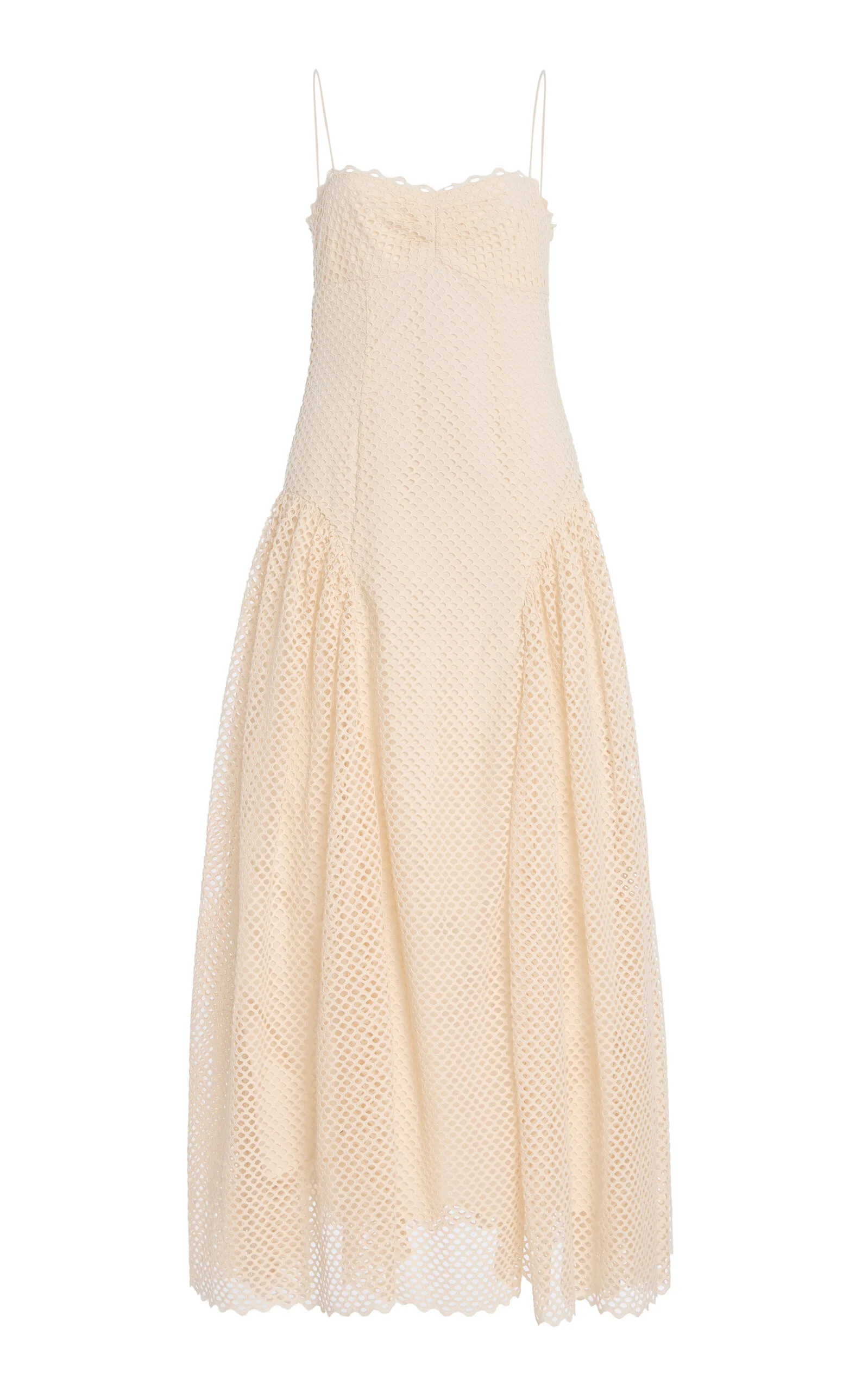 The latest in a series of artist collaborations, the Spring / Summer '26 collection taps the estate of abstract expressionist Helen Frankenthaler, whose influence is felt in genius color clashes (antique rose and acid green, blush and electric blue) and straight-from-the-canvas motifs. Made from mesh-like crocheted cotton, the 'Isotta' dress features a gently ruched bust, a fitted bodice, and gathered basque waist that create subtle volume. PRODUCT DETAILS - Spring '26 - Zipper fastening - Composition: 100% Cotton - Designer color: Cowrie - Dry clean - Imported