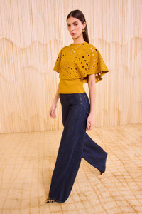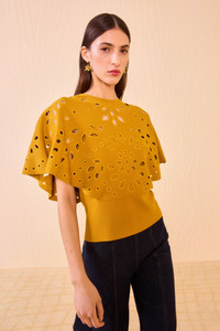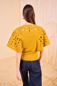 Inspired by a vintage Italian lace, the Josie Top is made from a compact knit into a graceful, cape-style silhouette adorned with botanical eyelet embroidery. This short-sleeve pullover is saturated a rich, dark yellow and perfectly complements our seasonal denim and separates. Composition: 83% Viscose, 17% Polyester Pair it with our Bianca Wide Leg Jean to complete the look. Size & Fit - Model Height: 5'10"