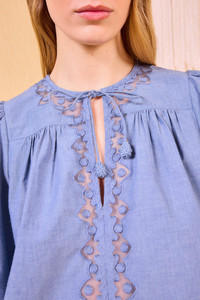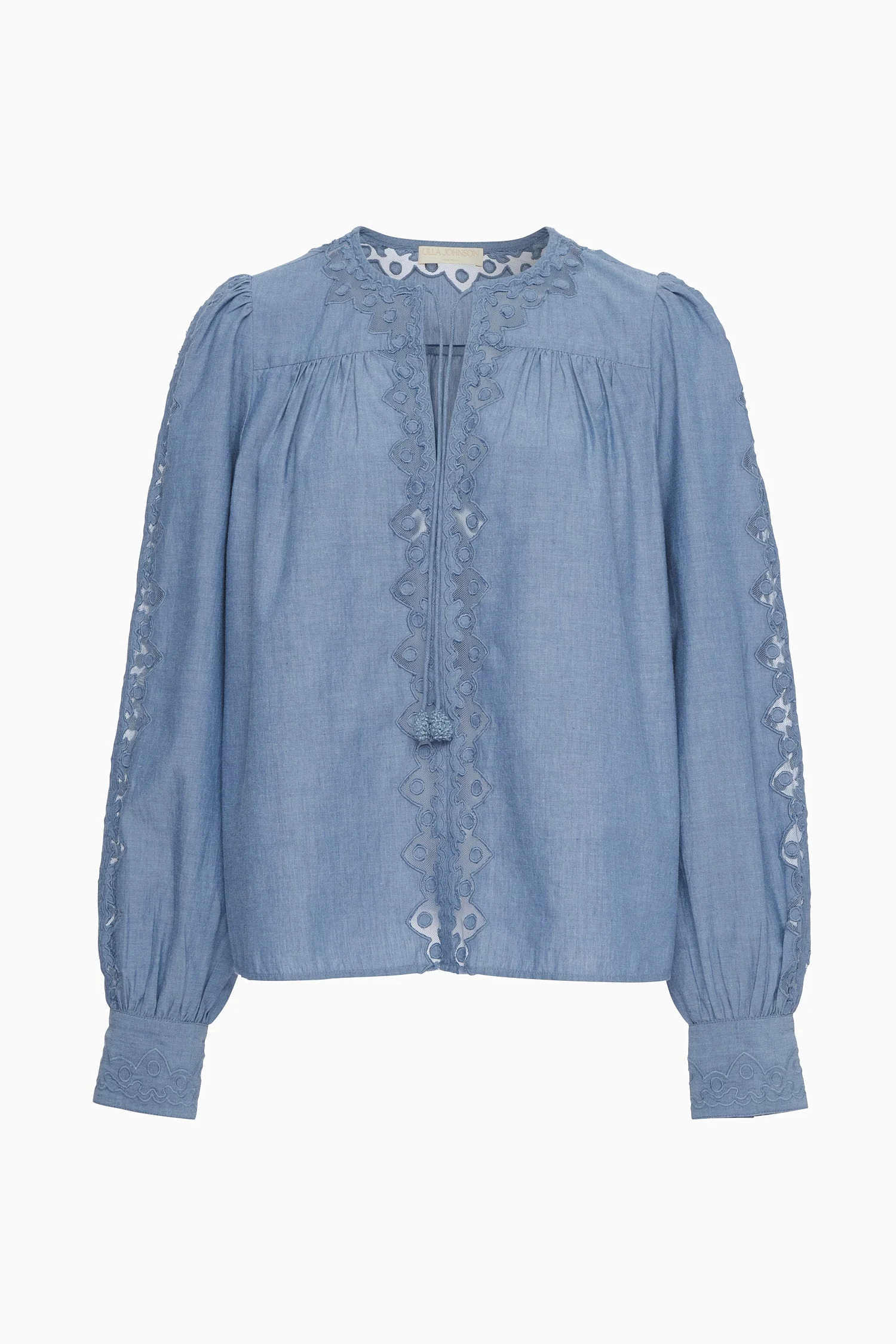 Rendered in a soft light blue, the Kady Blouse is elegantly traced with geometric embroidery and tulle appliques that create subtle transparency. This long-sleeve top is crafted from our signature water-washed cotton, with architectural gathers and a loose, effortless fit. Fasten the neckties or leave them undone for a more relaxed look. Composition: 100% Cotton Pair it with our Bianca Wide Leg Jean and Tahlia Woven Kitten Heel to complete the look. Size & Fit - Model Height: 5'11"