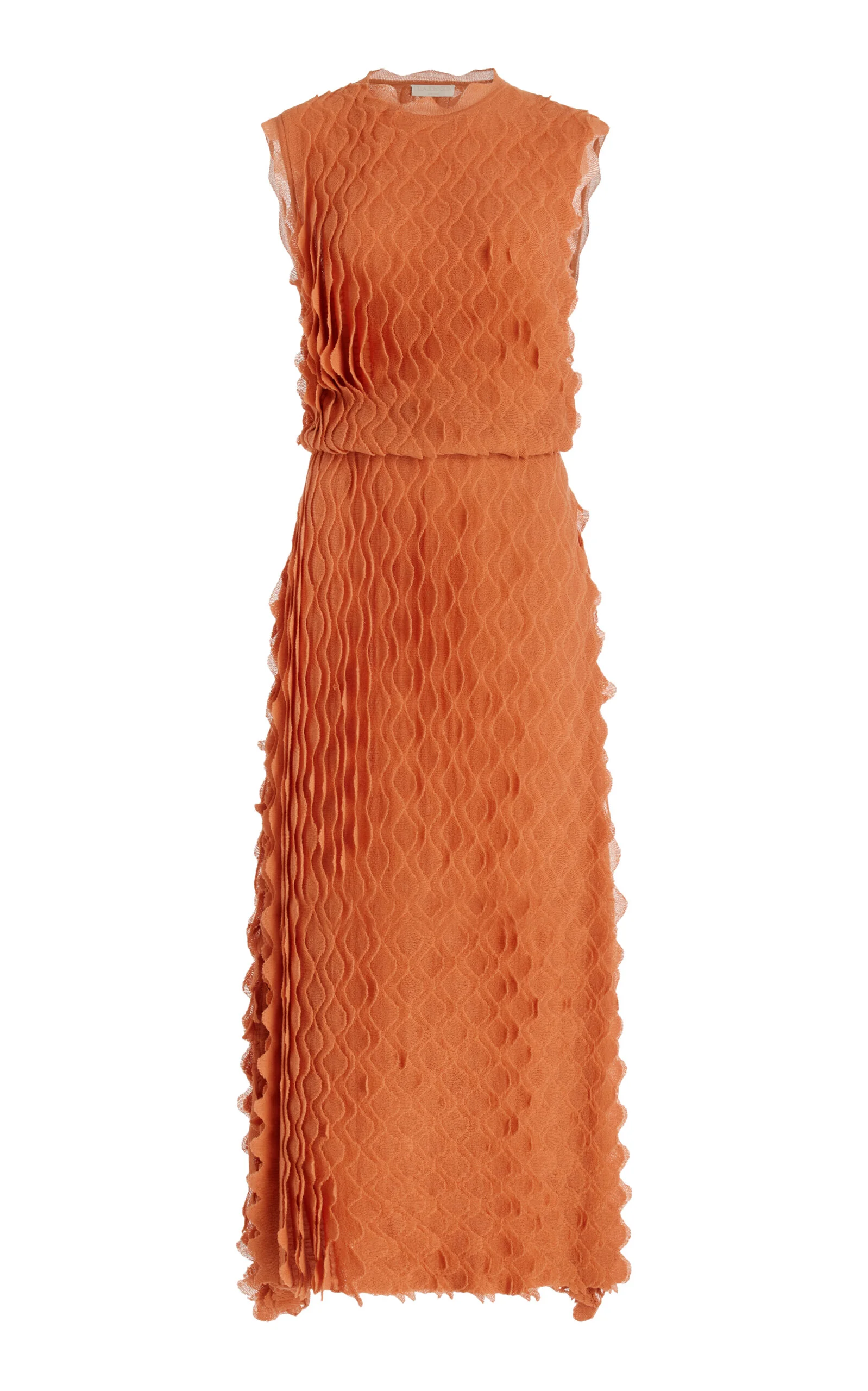 PRODUCT DETAILS - Wavy-cut texture, layered, draped bodice, sleeveless, maxi hem - Concealed zip fastening along back - Unlined - Composition: 87% Cotton, 13% Nylon - Color: neutral - Dry clean only - Spring/Summer '25