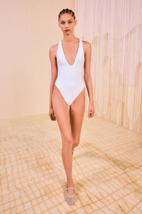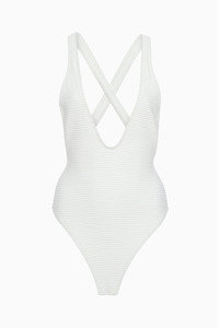 Full of texture and refinement, the Kaia Maillot is crafted from a soft and delicate Italian fabric with rows of finely sculpted scallops. It has a dramatic V-neckline and turns to reveal an open back with crossover straps. The high-cut leg elegantly elongates the frame, while the shell white shade adds a timeless element. Composition: 94% Polyamide, 6% Elastane Size & Fit - Model Height: 5'10" - High-cut swimsuit with minimal coverage brief.